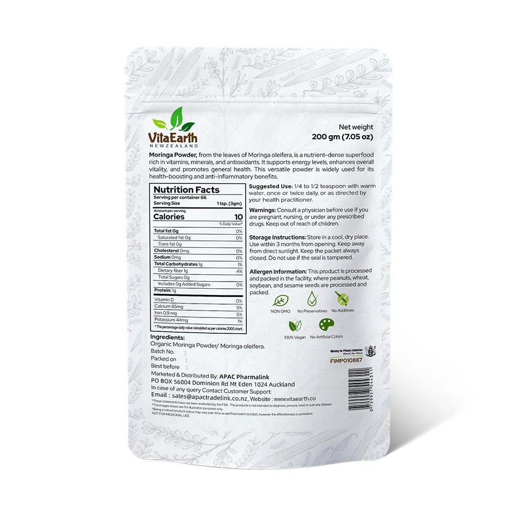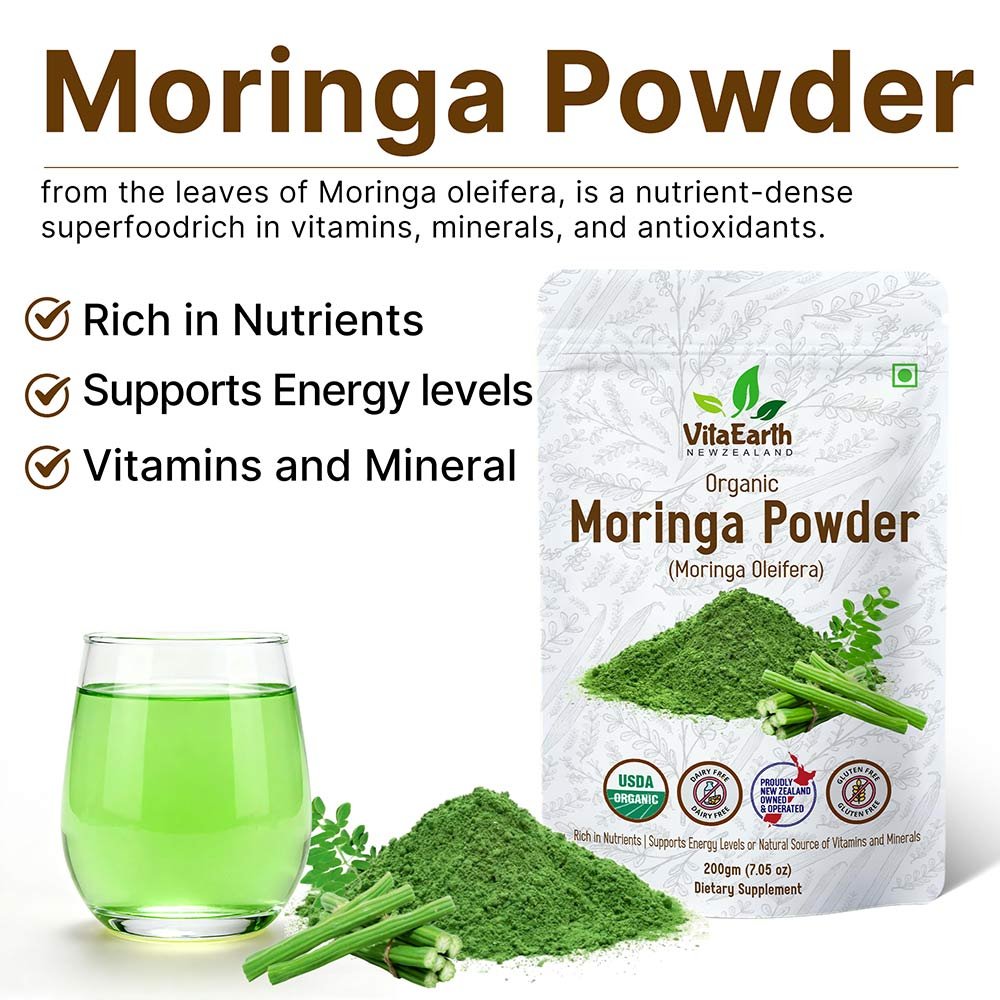 Nourish your body with the natural power of VitaEarth Organic Moringa Powder, a nutrient-dense superfood made from carefully selected organic moringa leaves. Often called the “Miracle Tree”, moringa is valued for its rich nutritional profile and its ability to support daily energy, vitality, and overall wellness.